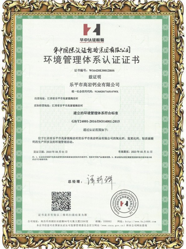 環(huán)境管理體系認證證書